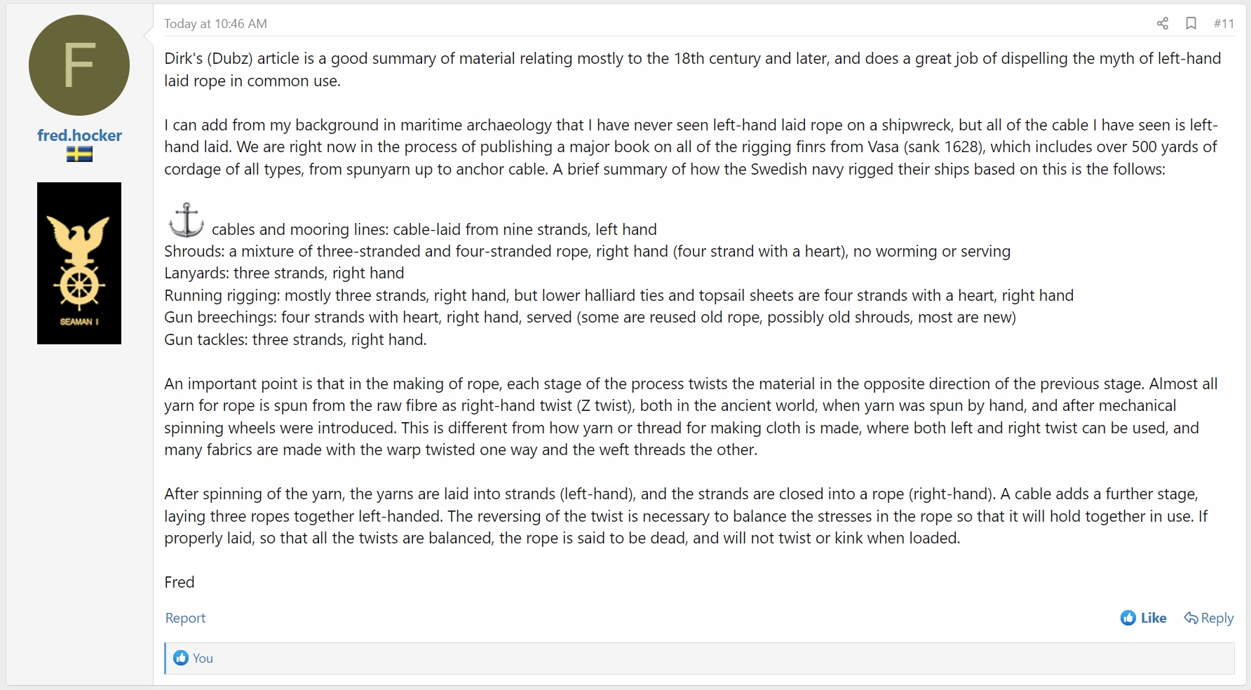 Reference to left handed "plain-laid rope", note the date: